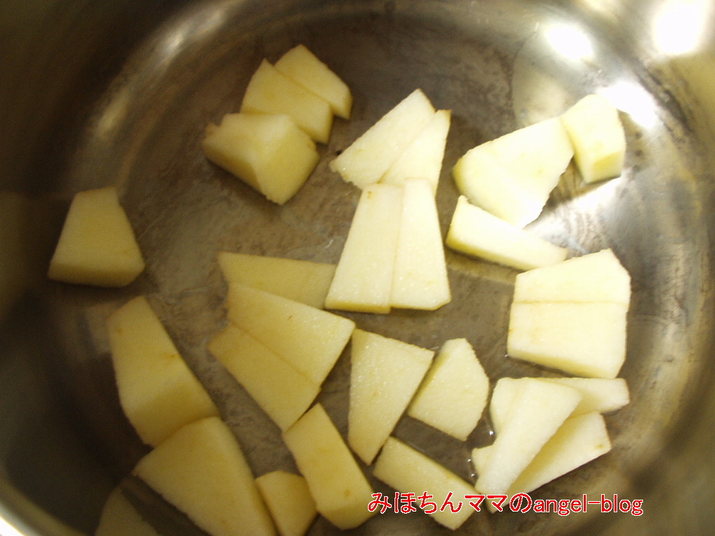 1.リンゴを小さく切り、弱火にかけて砂糖を加え