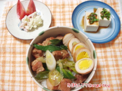豚の角煮が濃いので、サラダ(前日の残り物)と冷奴で