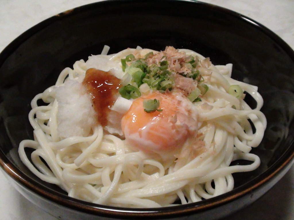 .お皿にうどんを盛り付け、上からネギ・大根おろし温泉玉子・鰹節を乗せ、のっけてジュレを添える。