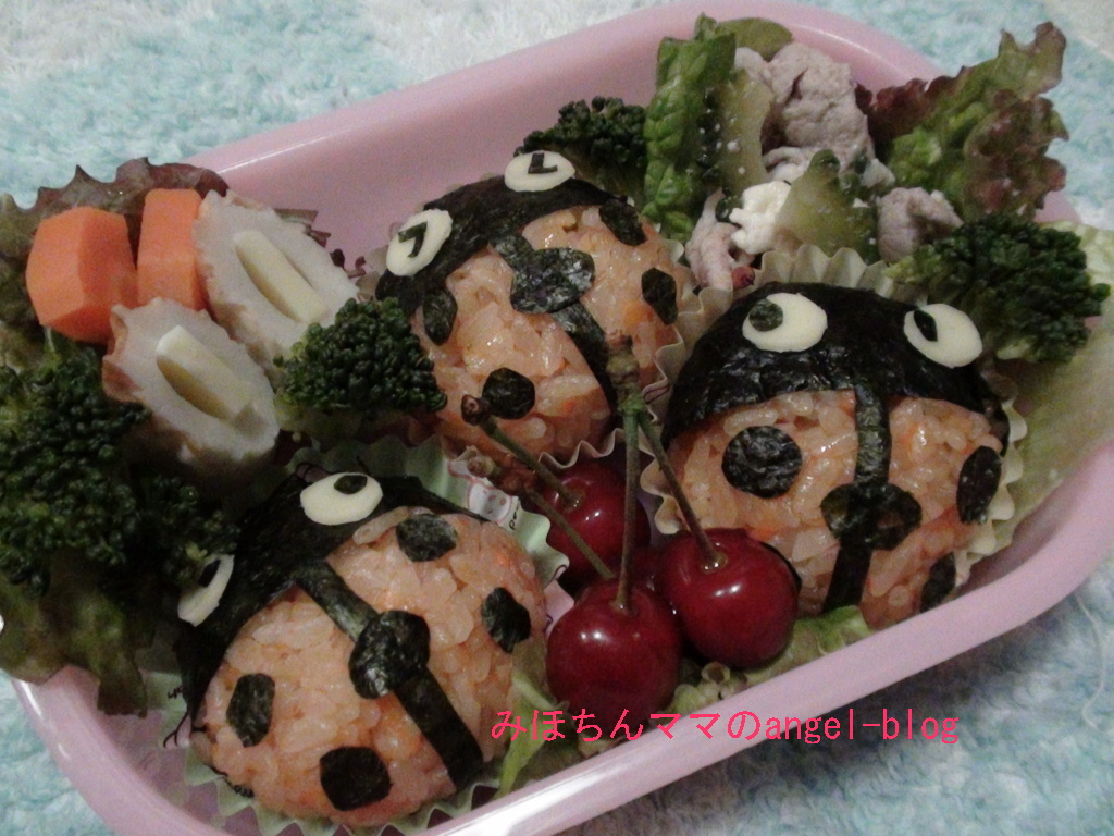 幼稚園の手作り弁当☆トラコミュ集てんとう虫は、みじん切りにした人参・玉葱とご飯を