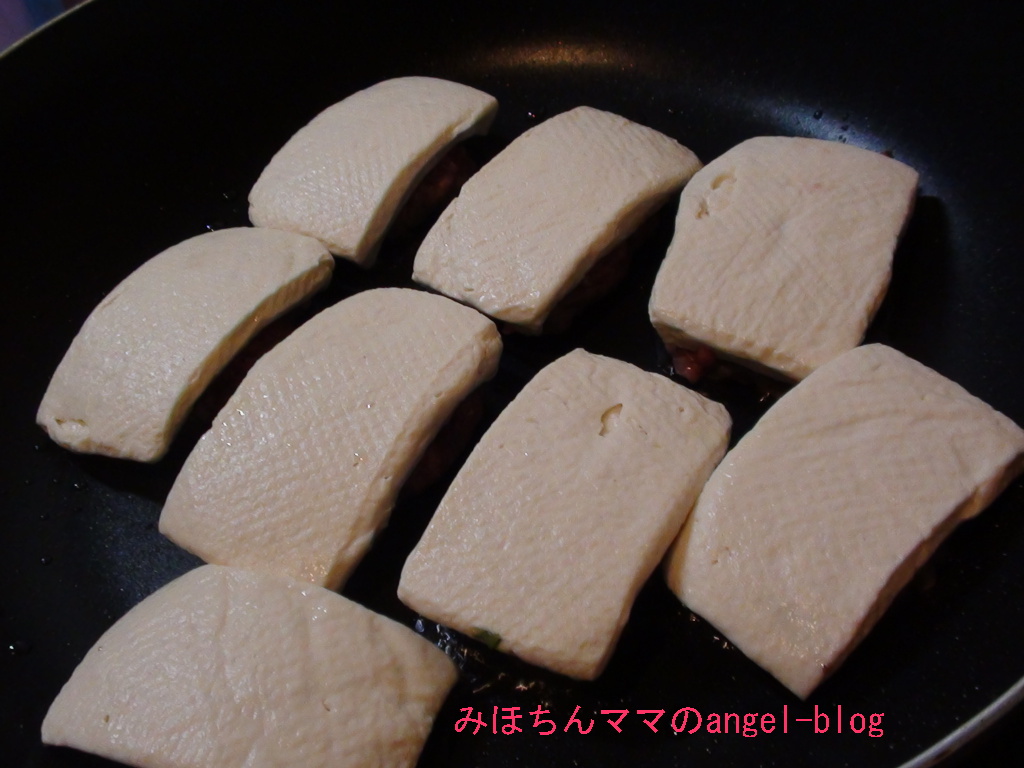 .木綿豆腐は半分の厚さに切って、2×2の4等分にする(1丁で8個できます☆)