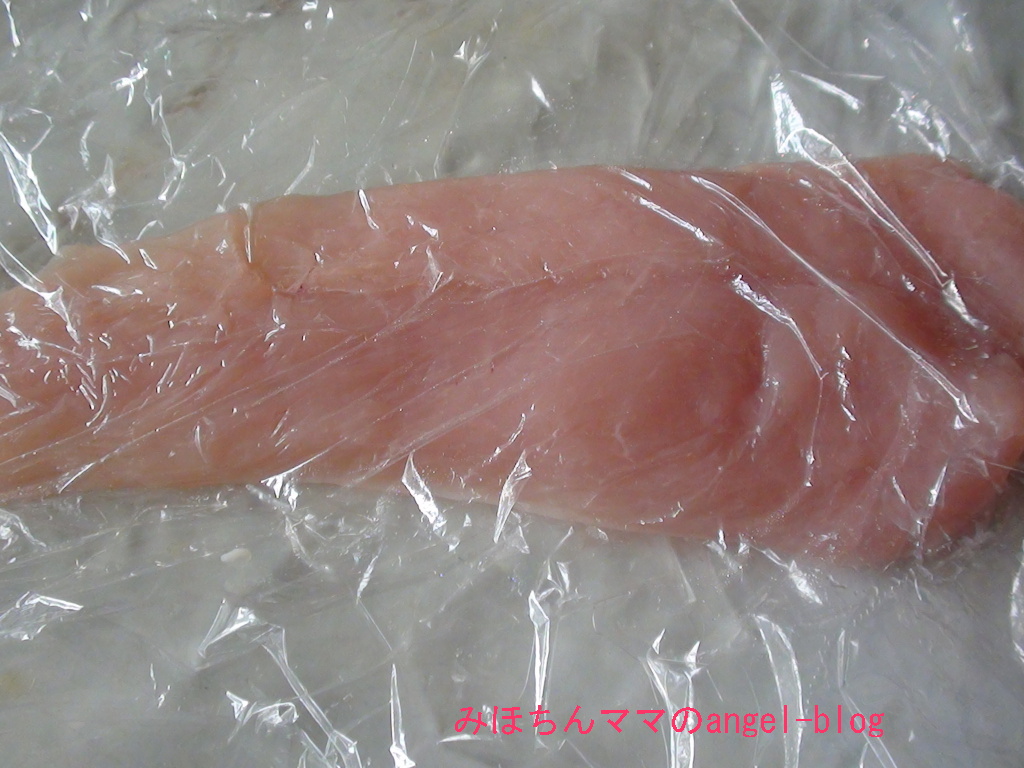 .鶏胸肉は縦3等分にして観音開きにし、ラップで挟んで綿棒で薄くのばし、軽く塩コショウをしておく。