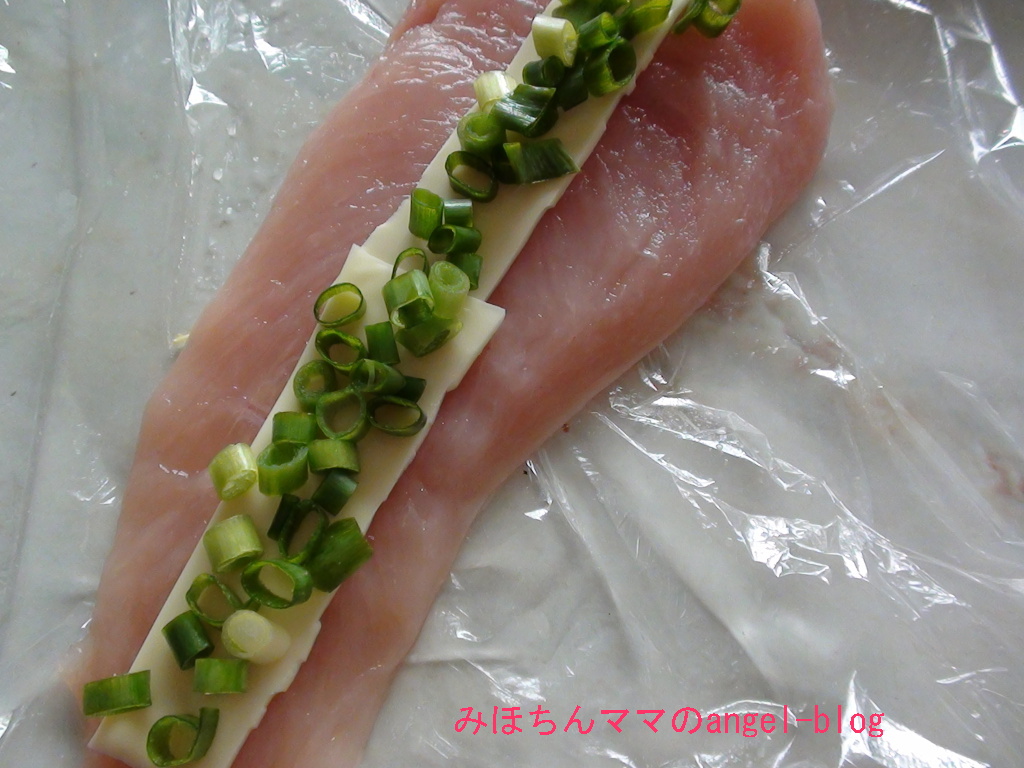 .真ん中にチーズ&青ネギを乗せて上から鶏肉を重ね、ラップを乗せて綿棒で軽く押さえて合わせる。