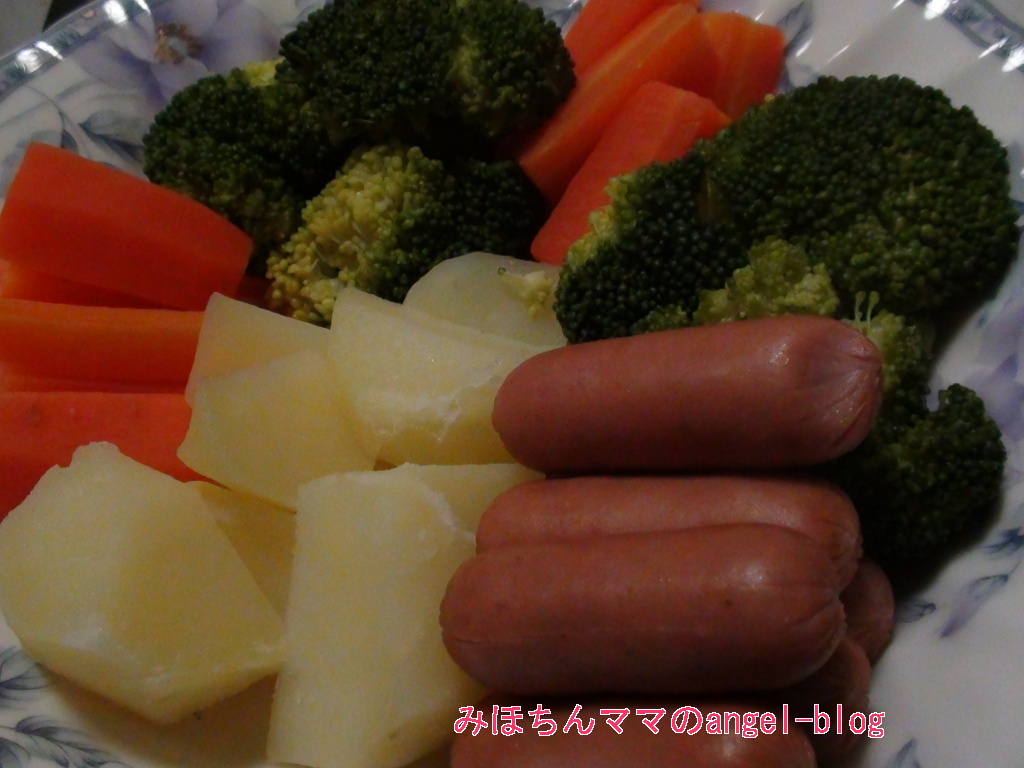 ↑これで2人分☆ブロッコリ・人参・ソーセージ・ジャガイモ。