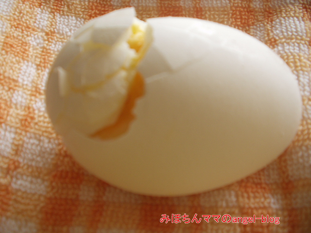 お手伝いブームの娘と一緒に、ゆで卵の殻むきをしていました。