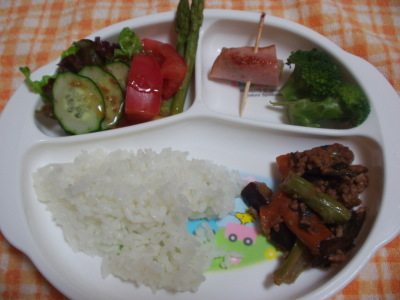 具は「茄子・人参・ブロッコリの茎・アスパラ・ひき肉」です。