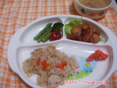 炊き込みご飯は、人参・うす揚げ・鶏肉・椎茸・ゴボウ入り☆