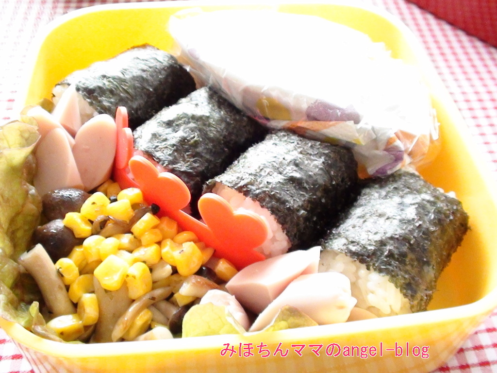 おにぎり4つ。しめじとコーンのバター炒め。魚肉ソーセージ。