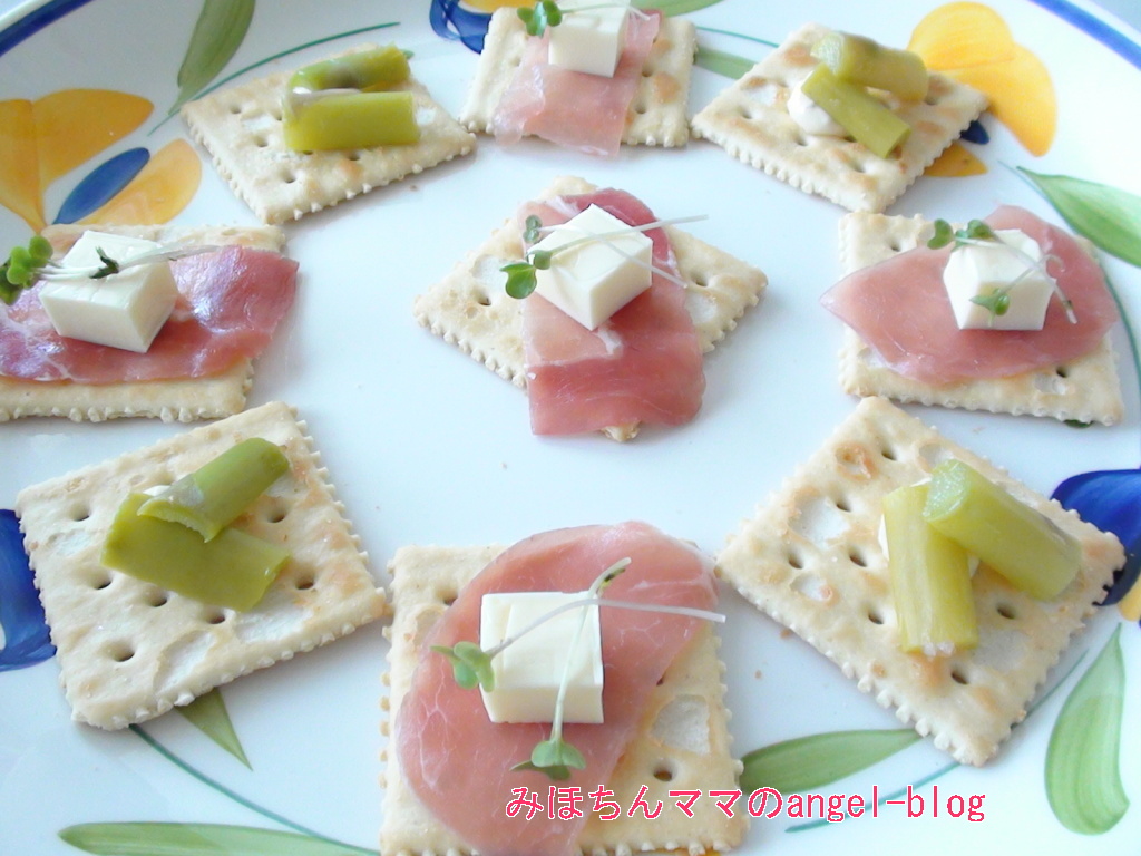 クラッカーに生ハム・チーズ・ブロッコリの芽。