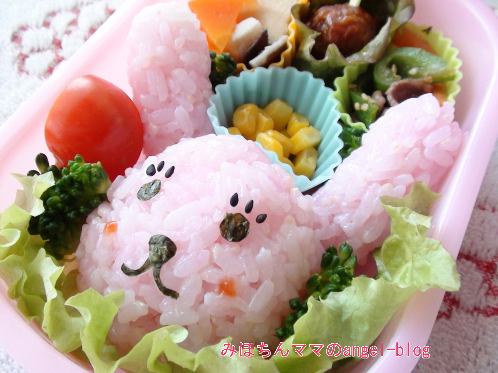幼稚園のキャラ弁☆トラコミュ集うさぎちゃんのピンク色は毎度おなじみ、粉末すし酢のピンク色を