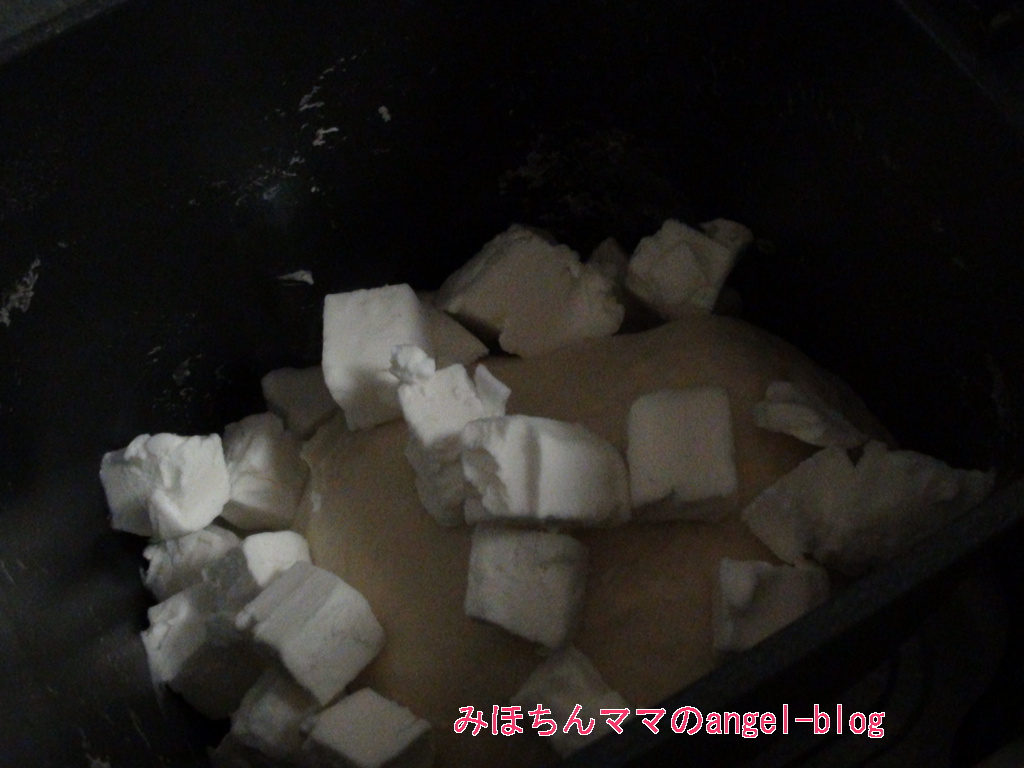 .パンケースに後入れ用バター以外の材料を入れて、スタートから25分後に後入れ用バターをほぐして入れる。