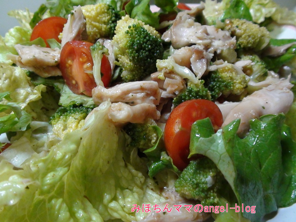 鶏肉をほぐして、レタス・トマト・ブロッコリと一緒に。