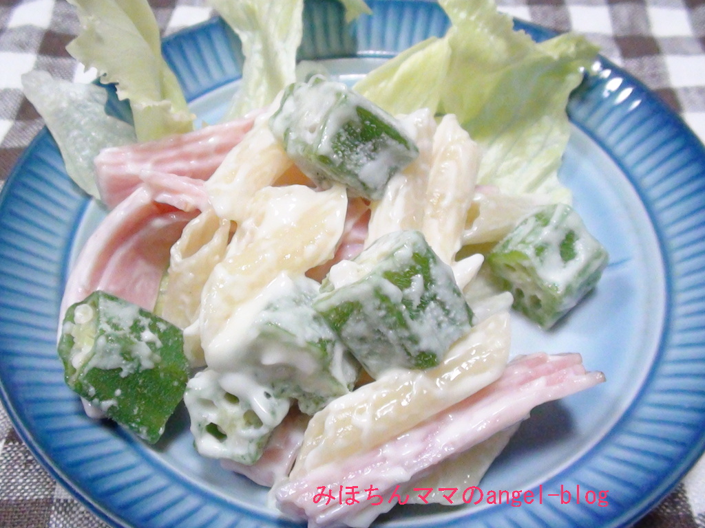 野菜室にオクラがあったので、ペンネとハムでサラダ☆