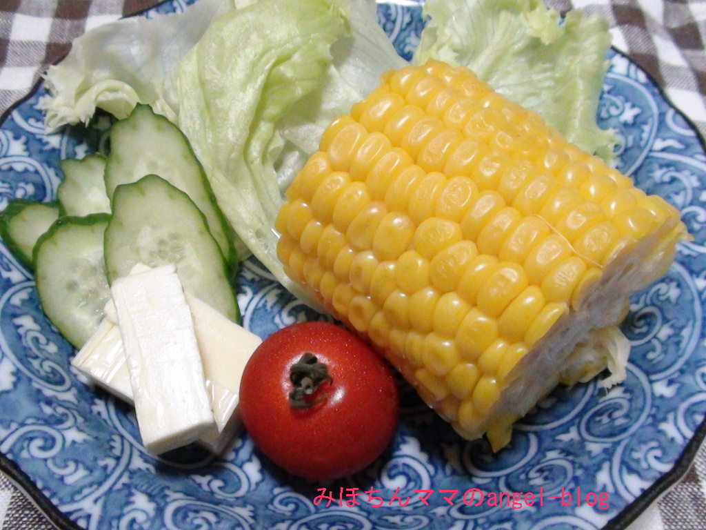 レタス・キュウリ・プチトマトの生野菜と茹でとうもろこし。